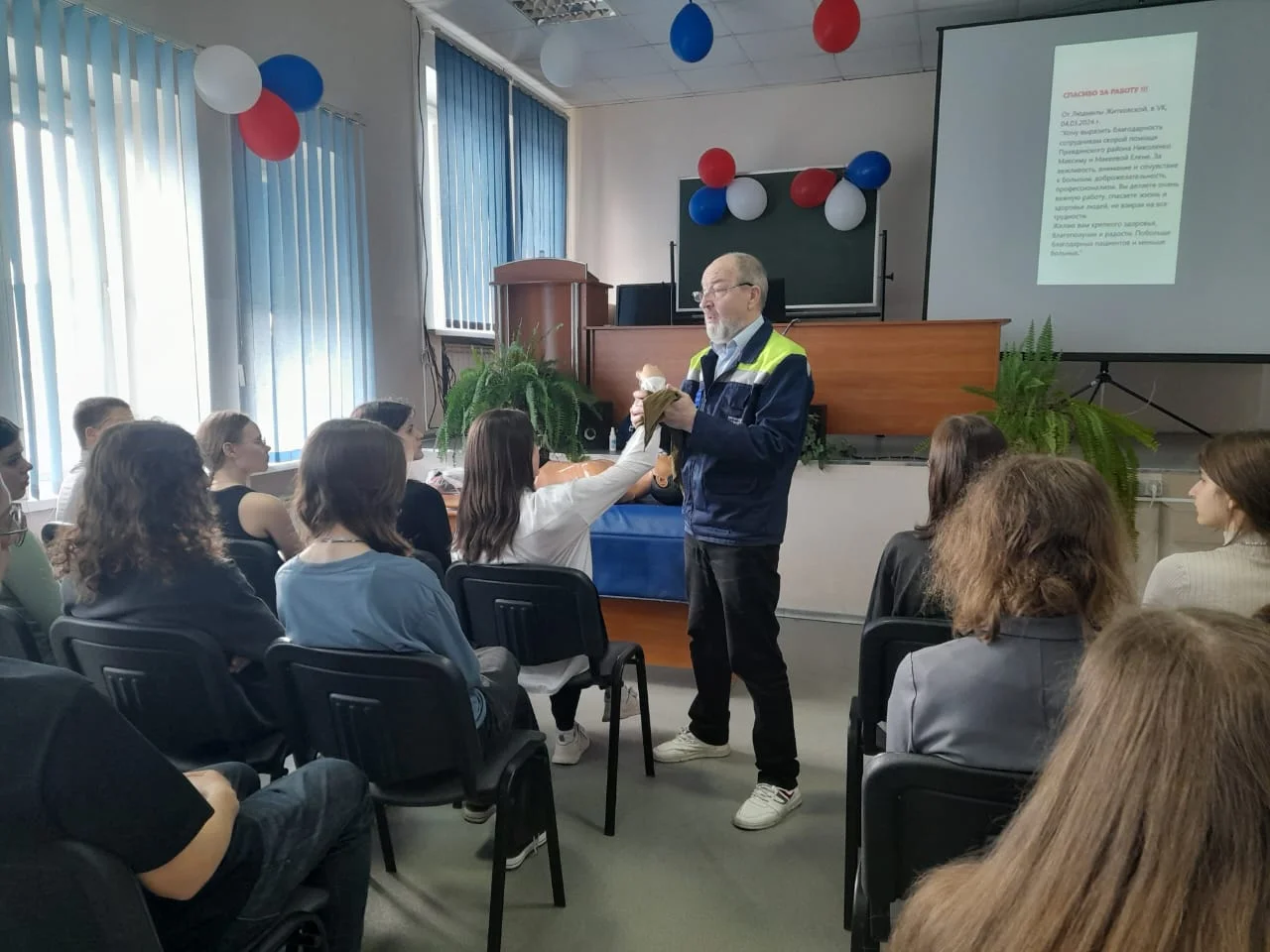 По окончании торжественной части праздника в гости к сотрудникам учреждения пришли ученики городской гимназии № 1 и школы № 38. Старшеклассникам продемонстрировали полное оснащение автомобиля класса В. Также подростки стали участниками настоящего лекционно-практического курса по оказанию первой доврачебной помощи, а также «пострадавшим» при чрезвычайных происшествиях.